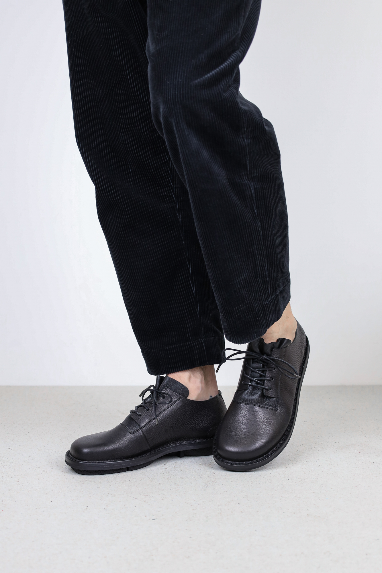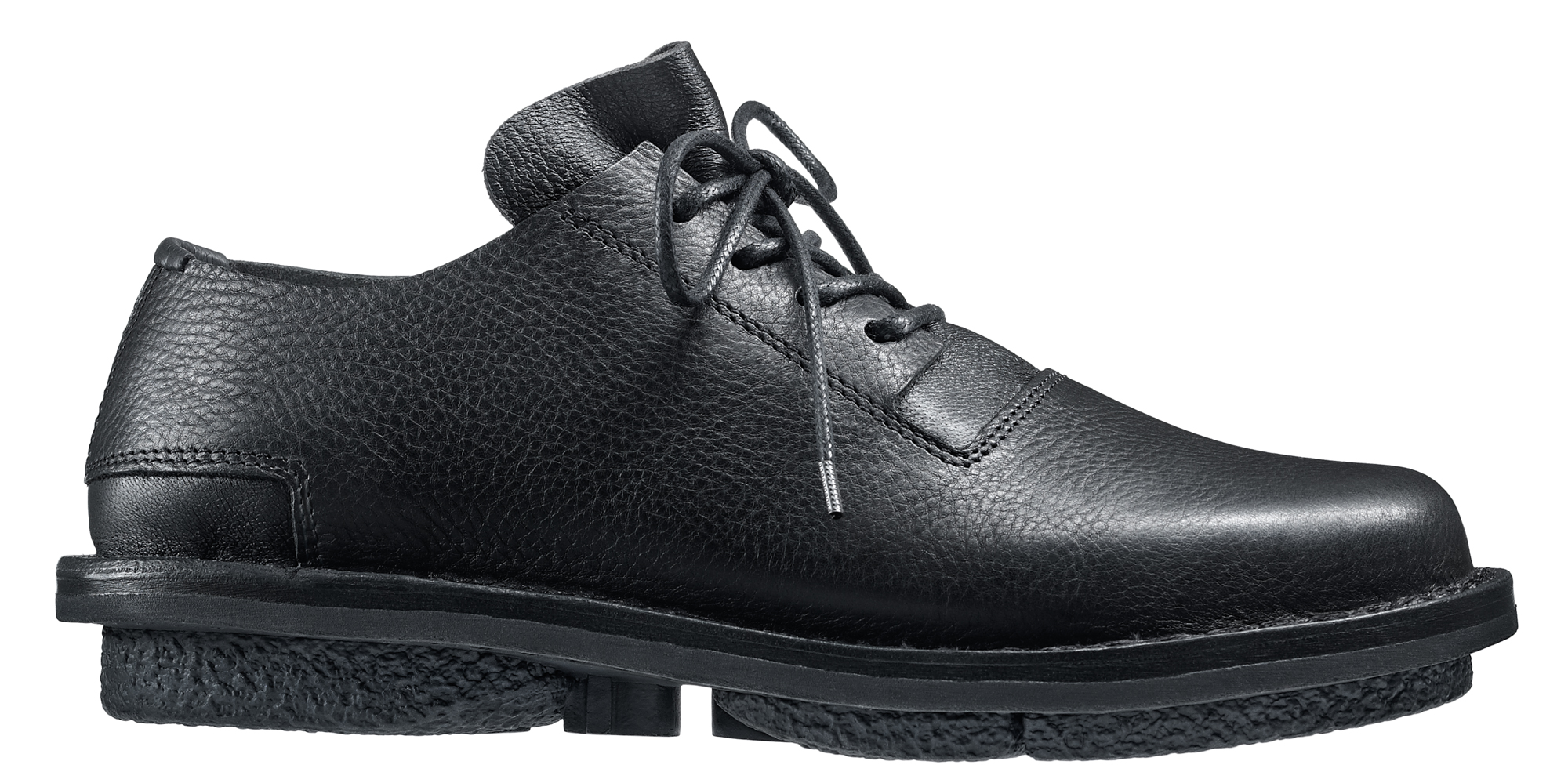 With two T-shaped cut-outs made from soft deerskin, the simple low shoe quotes classic geometric elements.