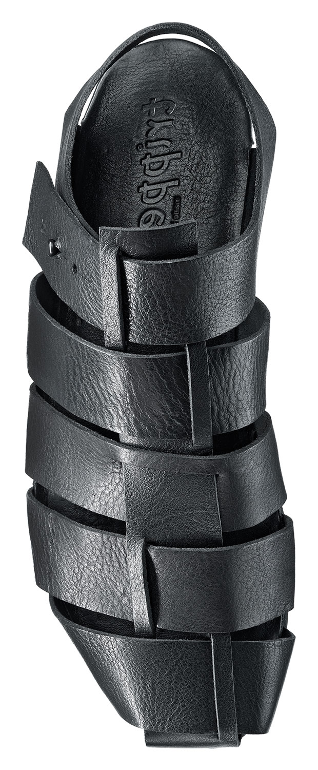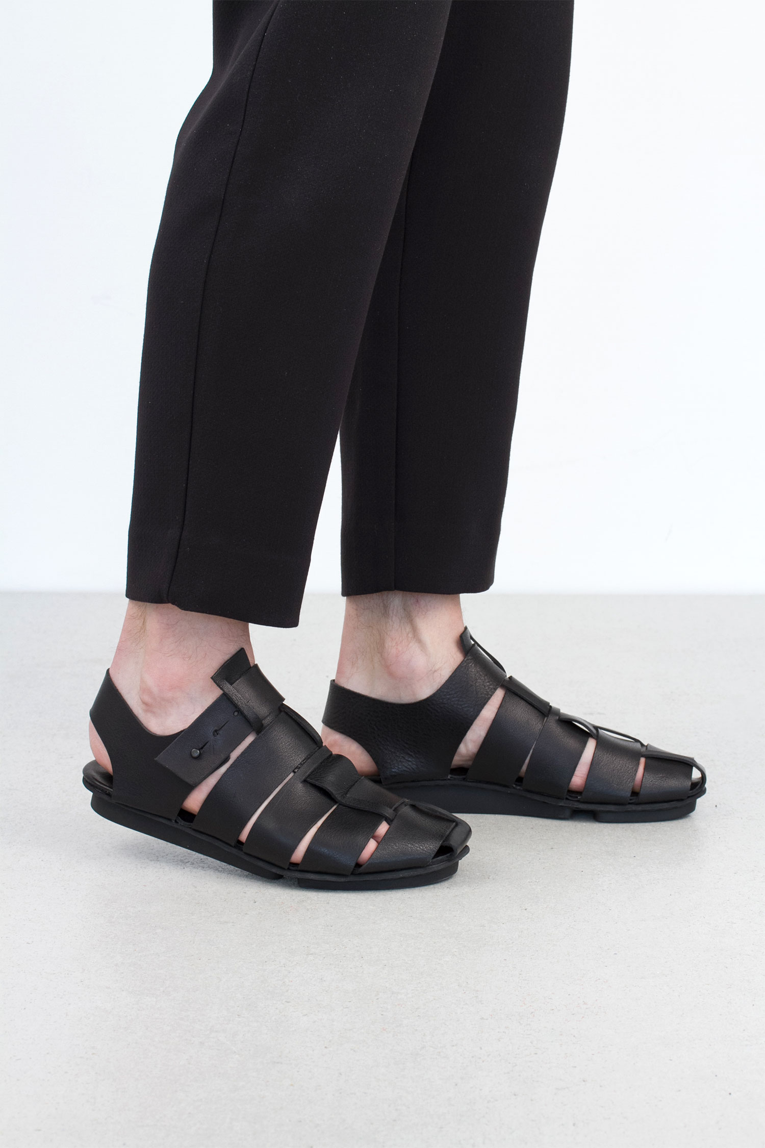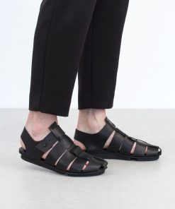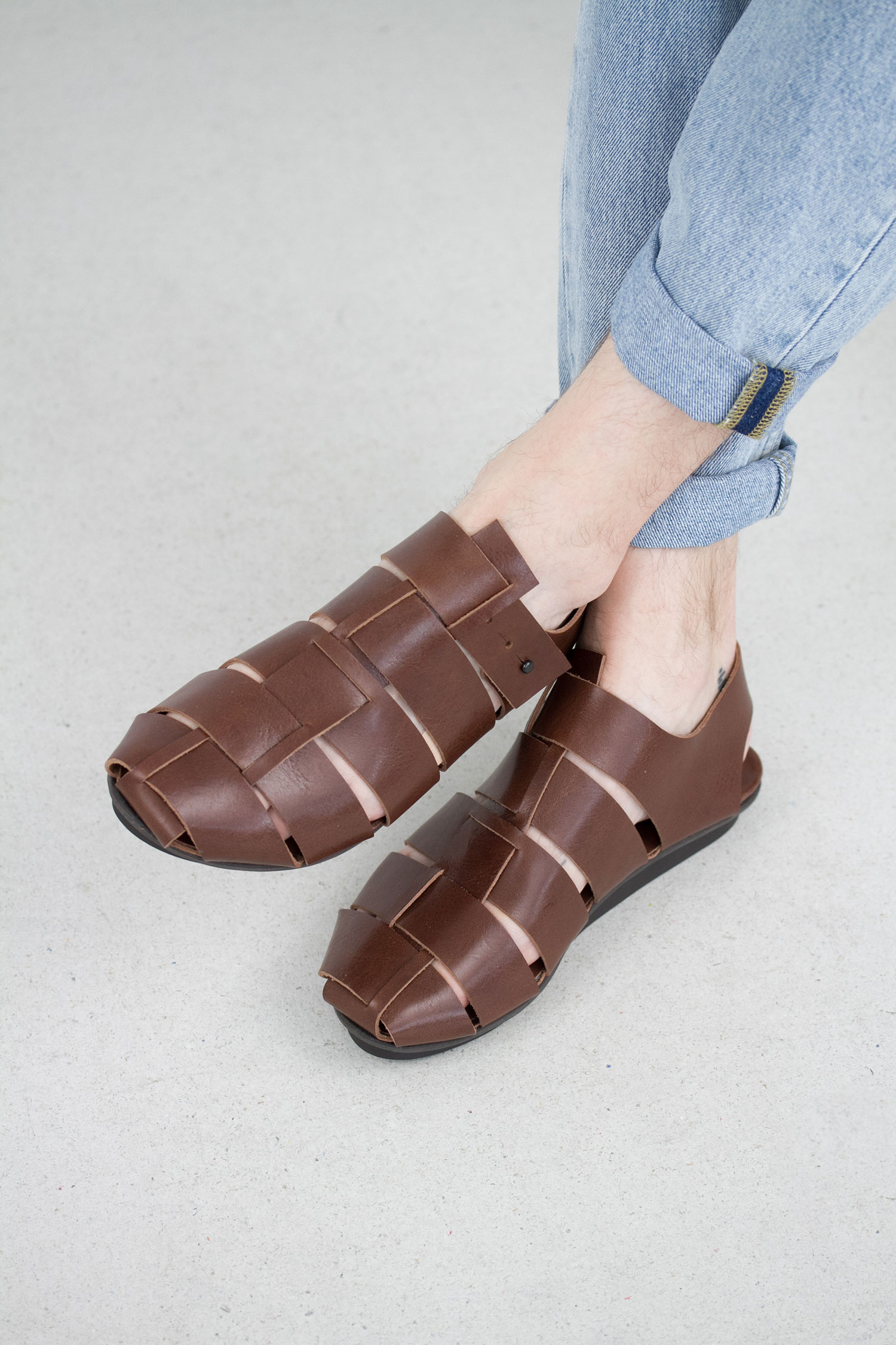 Tightly woven men’s sandal featuring a subtle connecting strap with a button fastening on the shoe’s exterior.