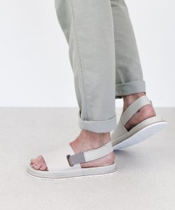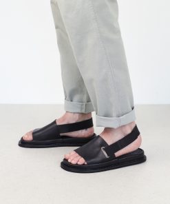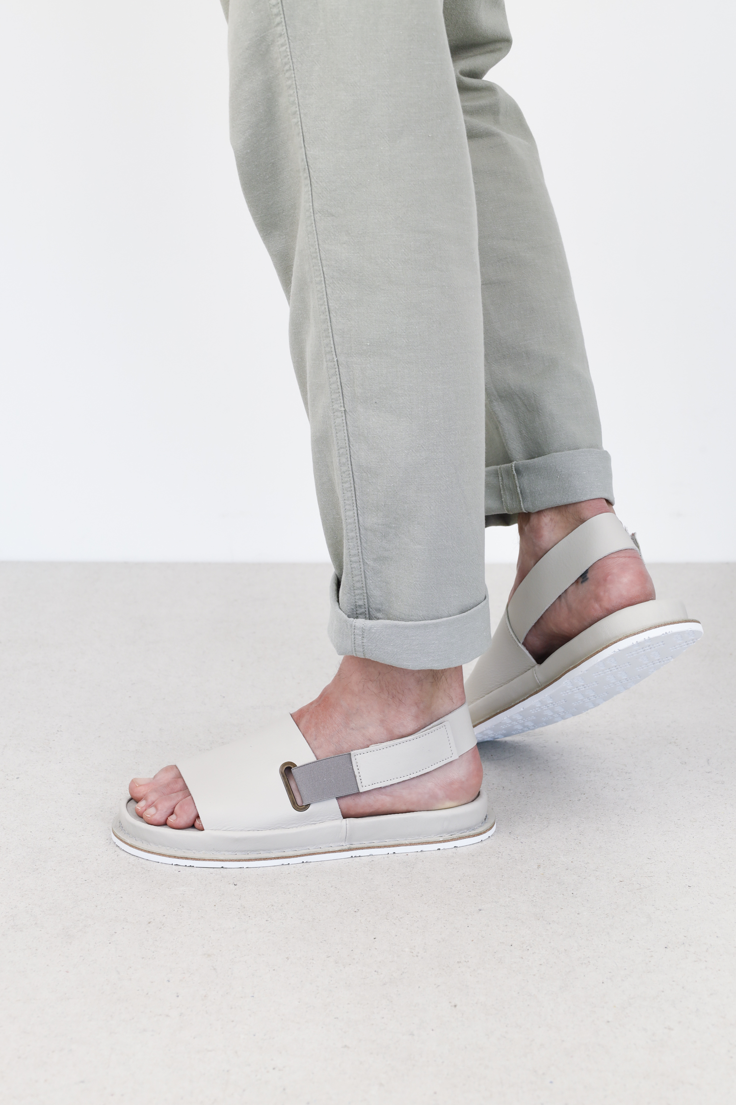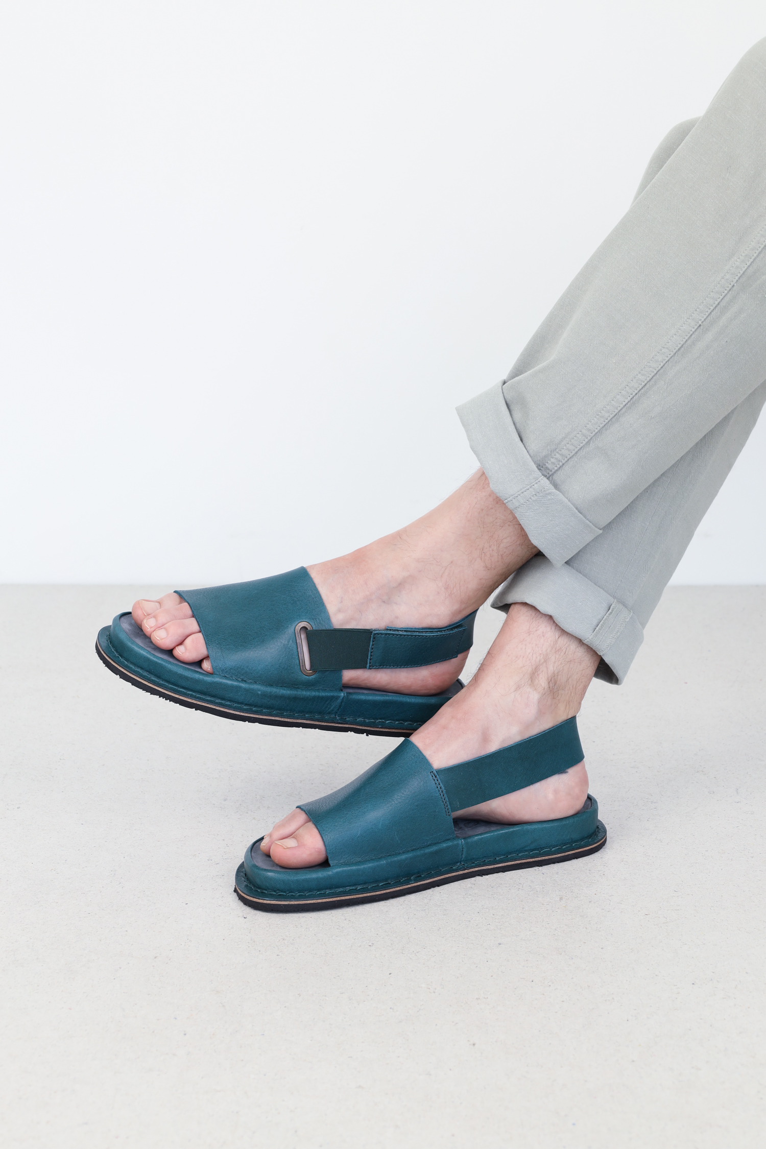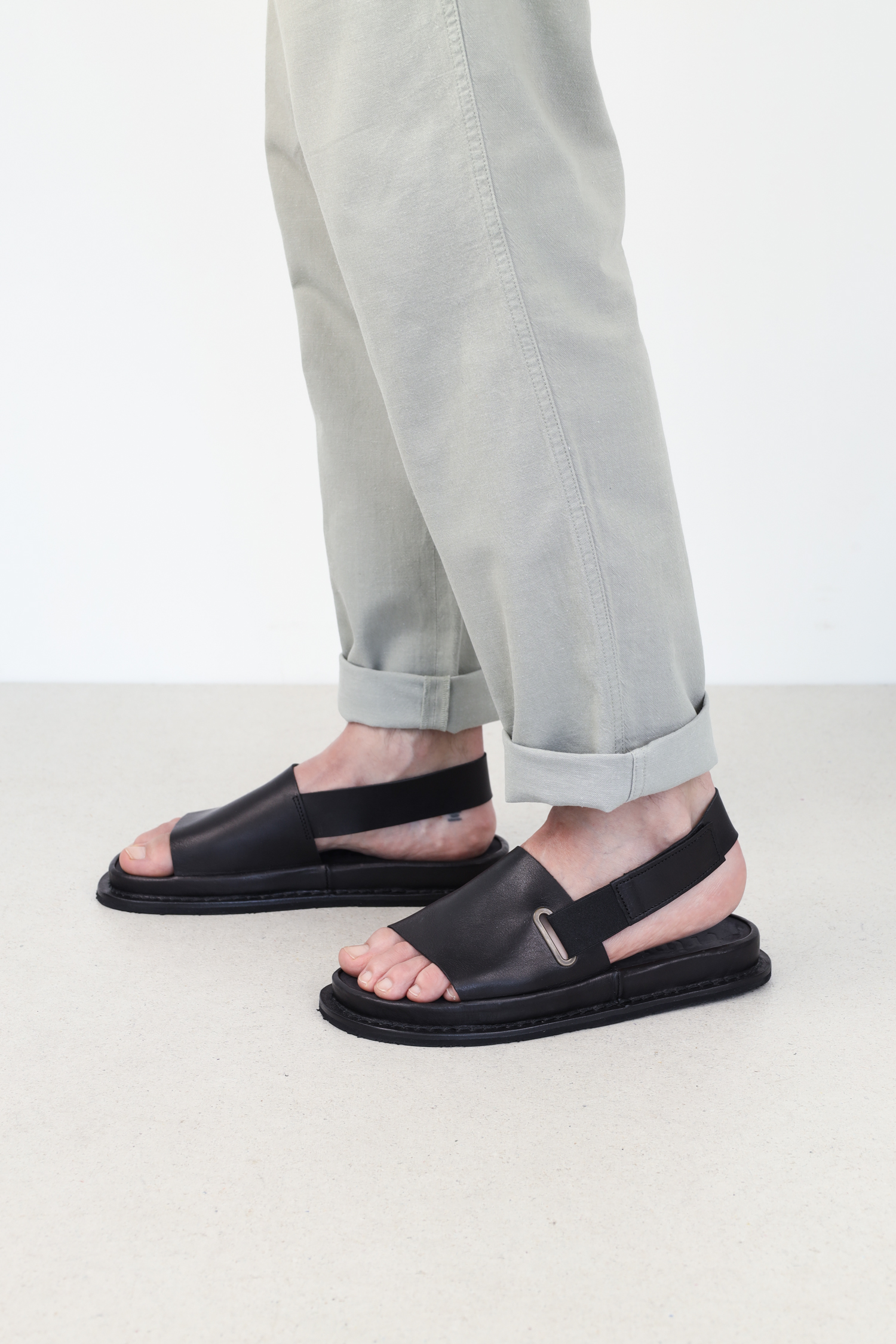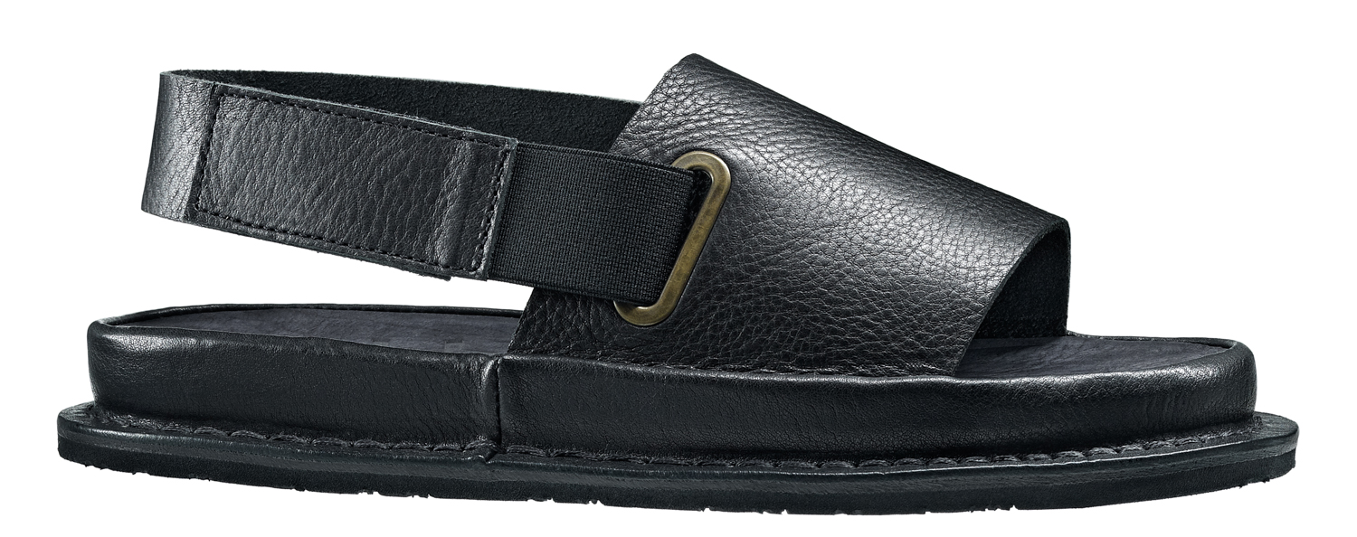 Simple unisex sandal with an elastic heel strap that passes through an eyelet and a Velcro strap closure.