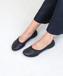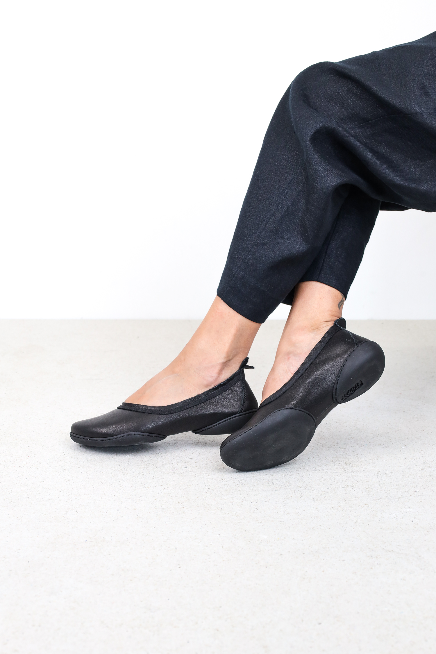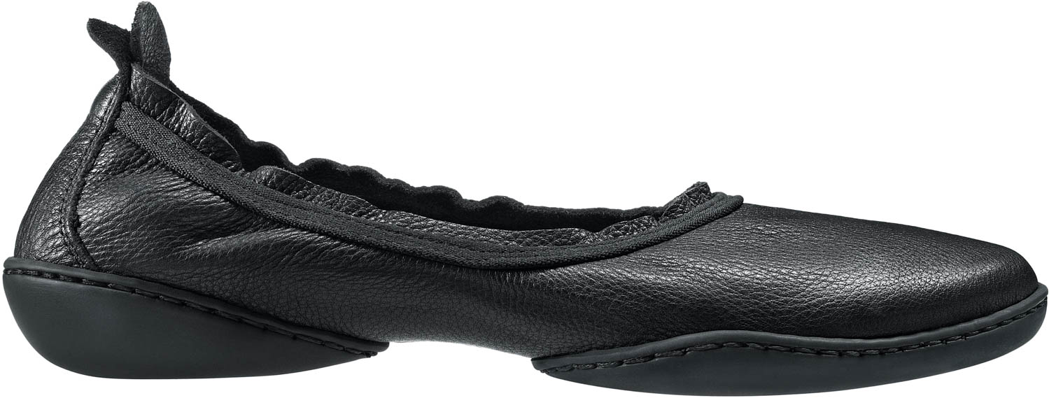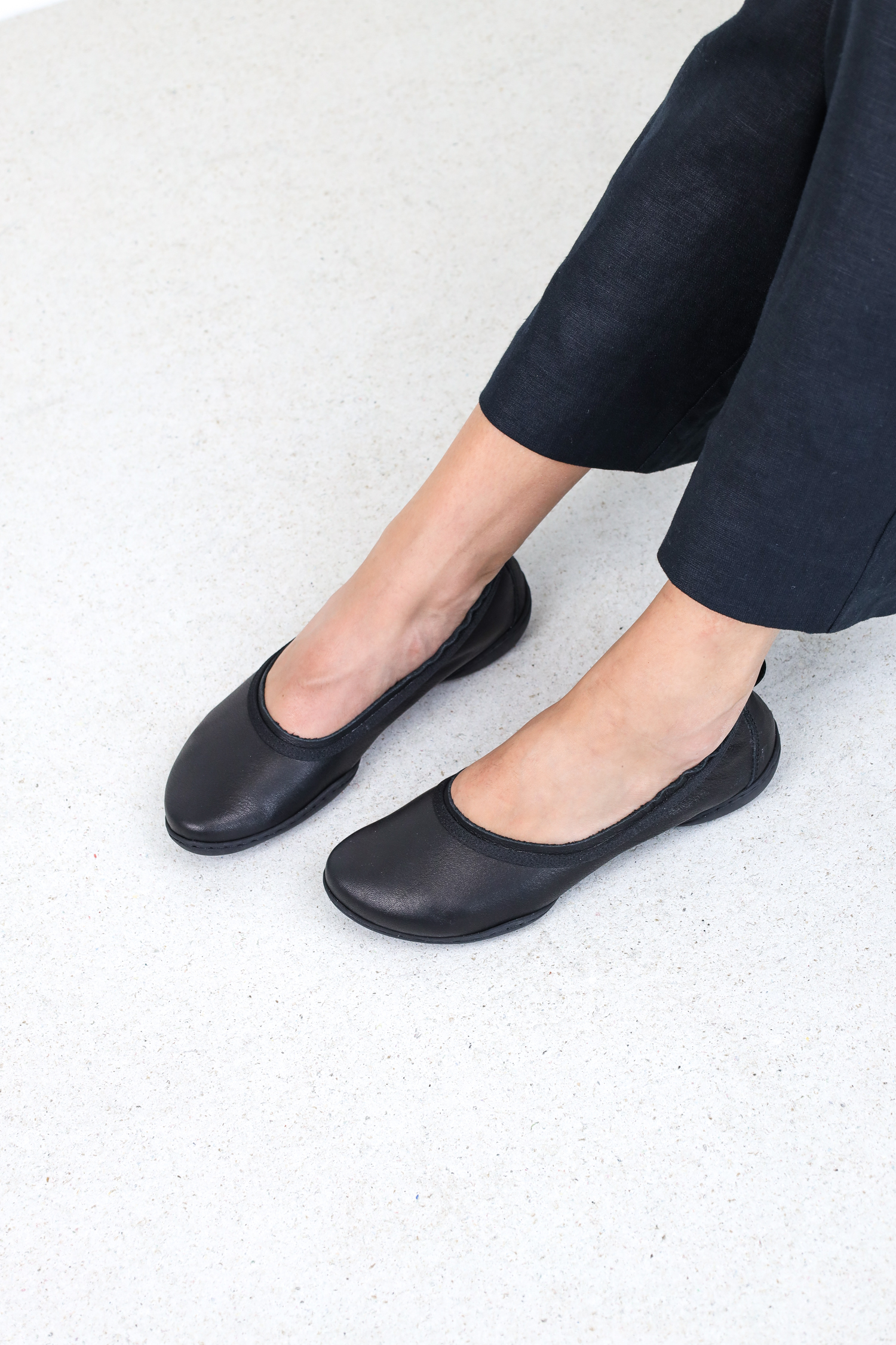 Plain ballerina shoe made of very soft leather, cut low at the sides. The flat elastic around the shaft edge gives support.