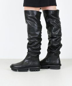 This thigh-high boot is flexible and loose-fitting, with an elastic that creates a ruched effect and provides more space in the leg of the boot.