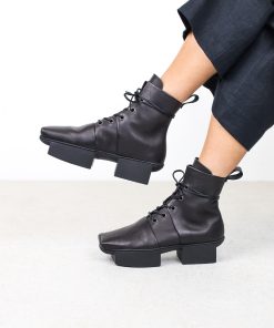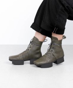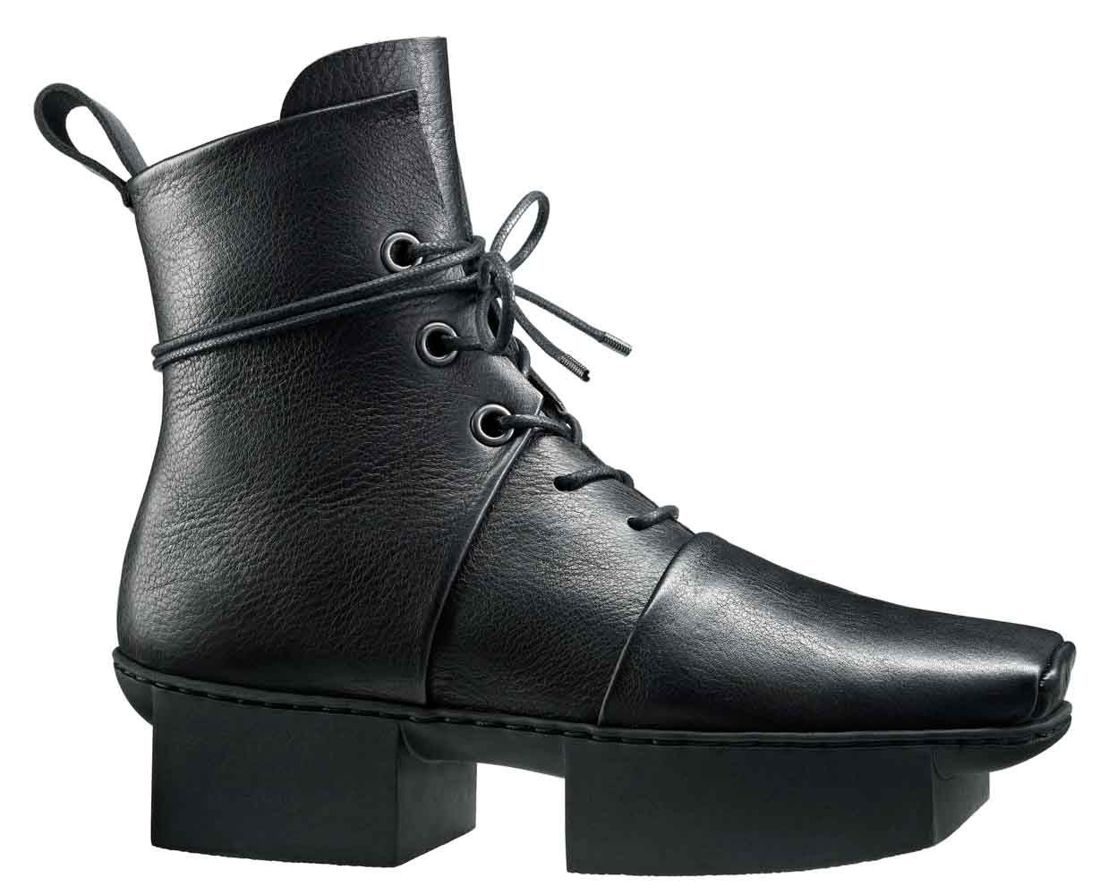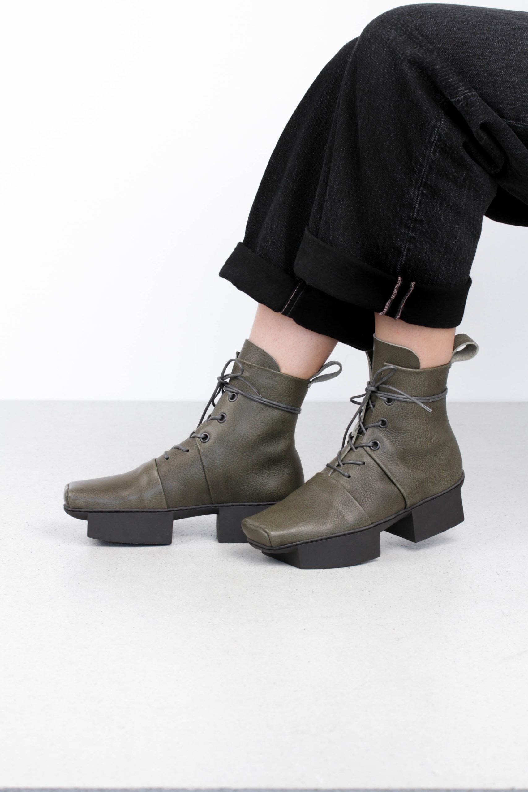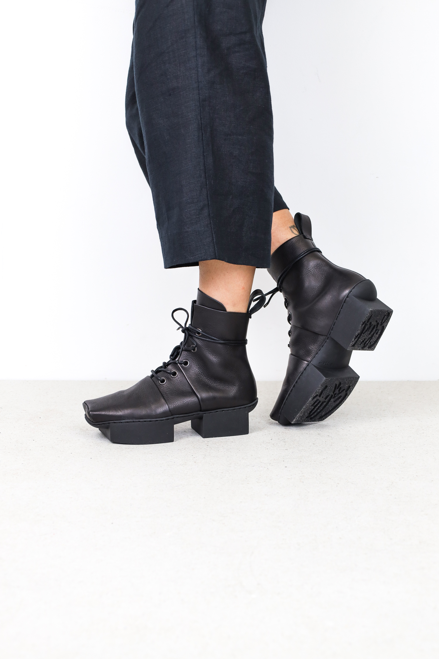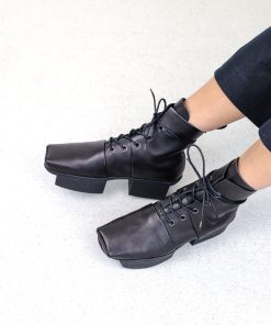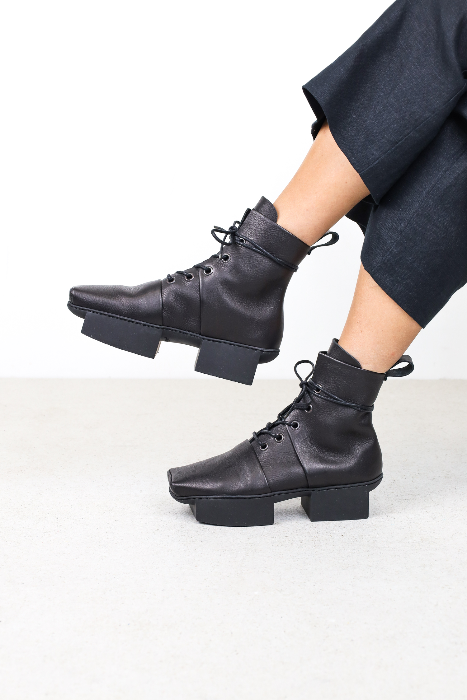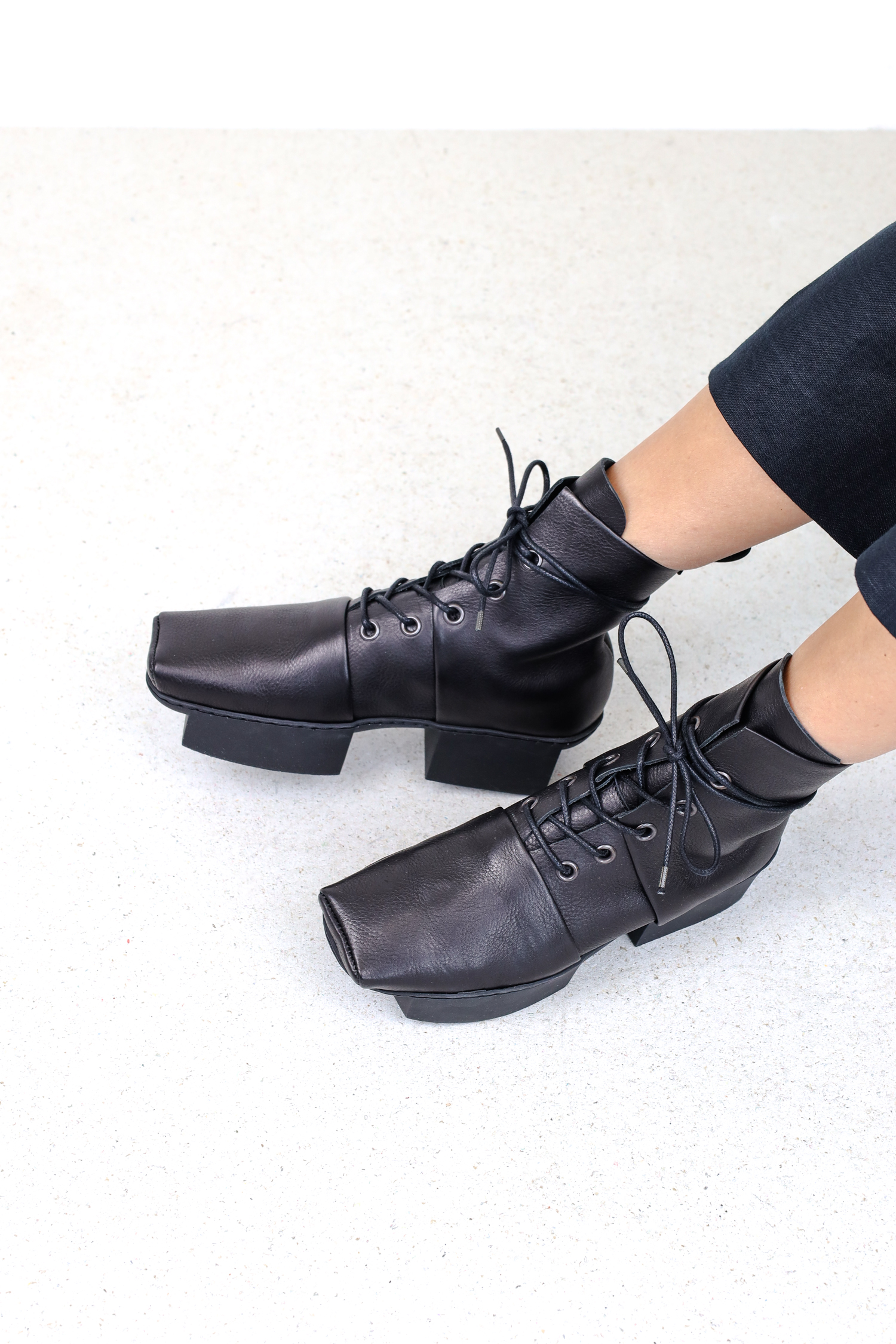 This boot evolves from a padded square toe into a classic lace-up with striking eyelets after a visual break in the middle.