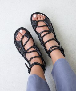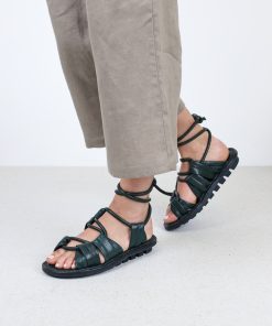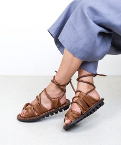 In an asymmetrical curved wave, a leather lace is passed through three soft leather loops on each side and tied up around the ankle.