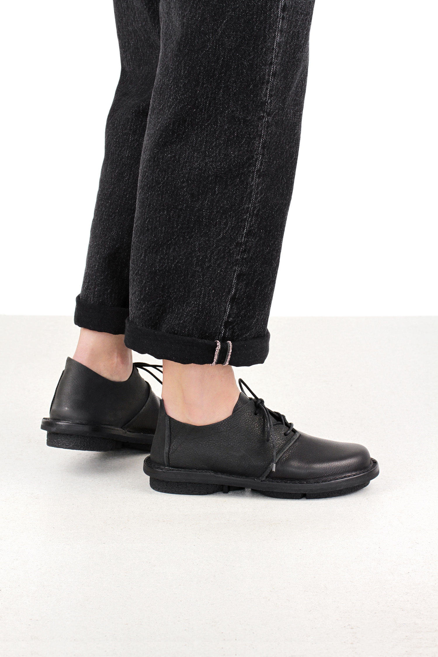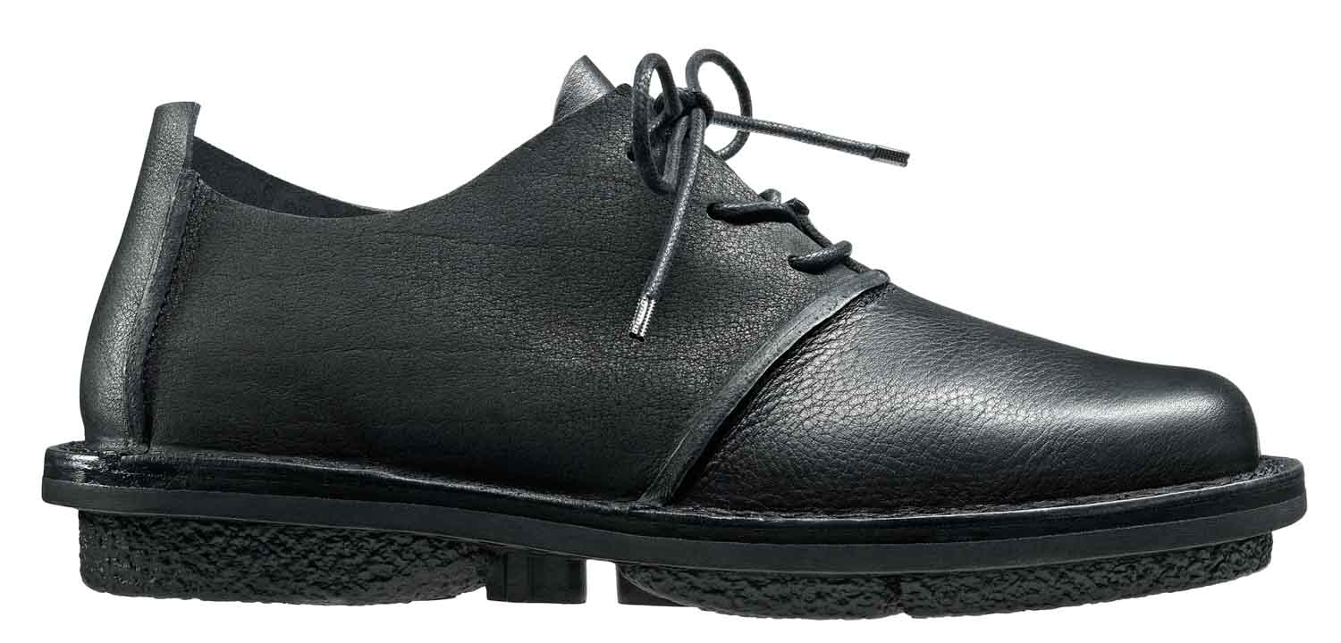 This lace-up low-cut shoe, featuring three different leathers, is composed of outwardly worked raw seams.