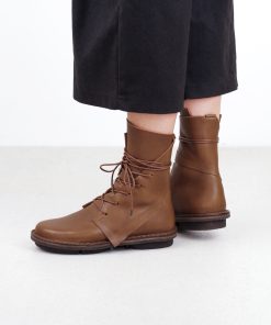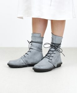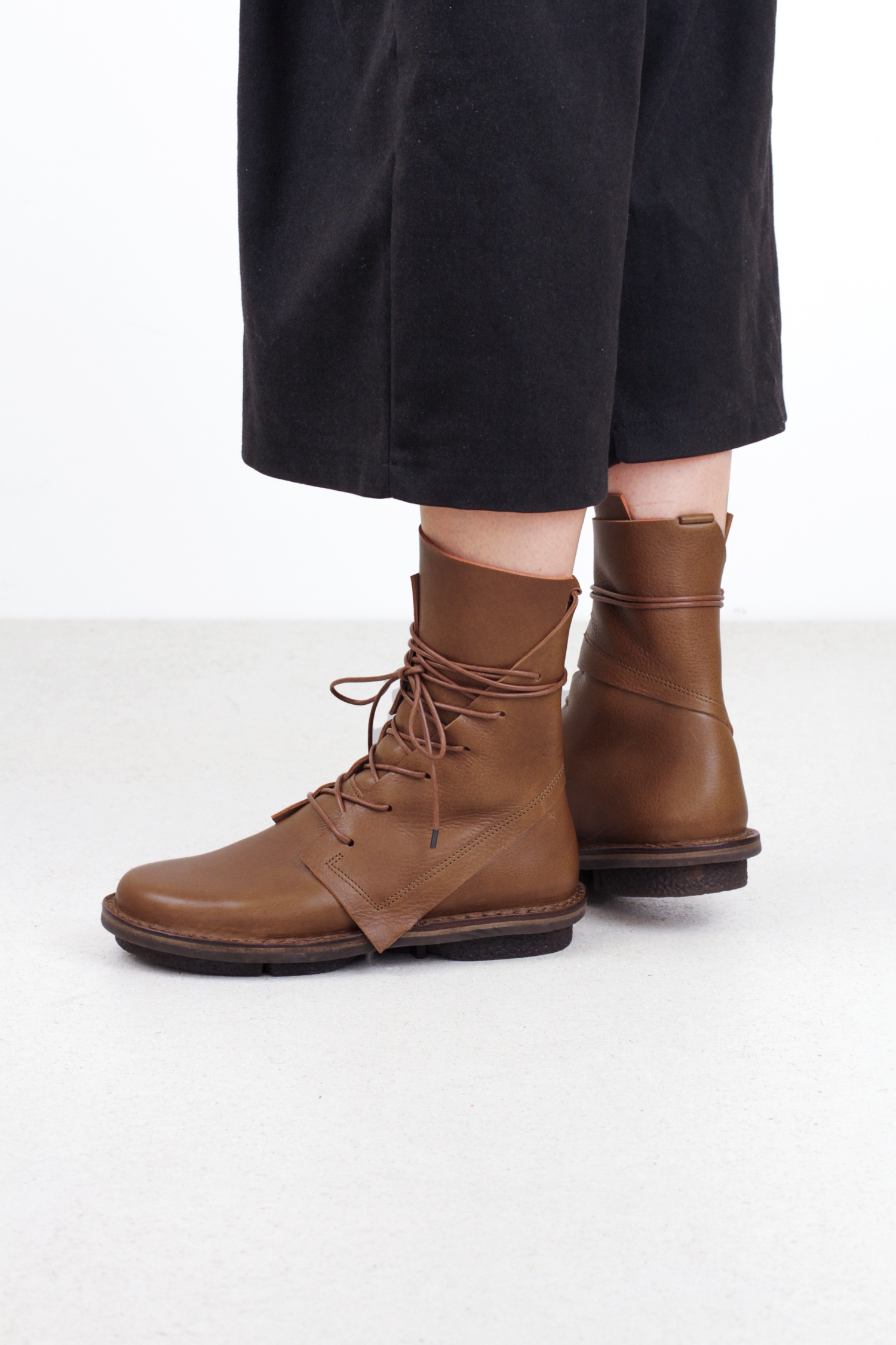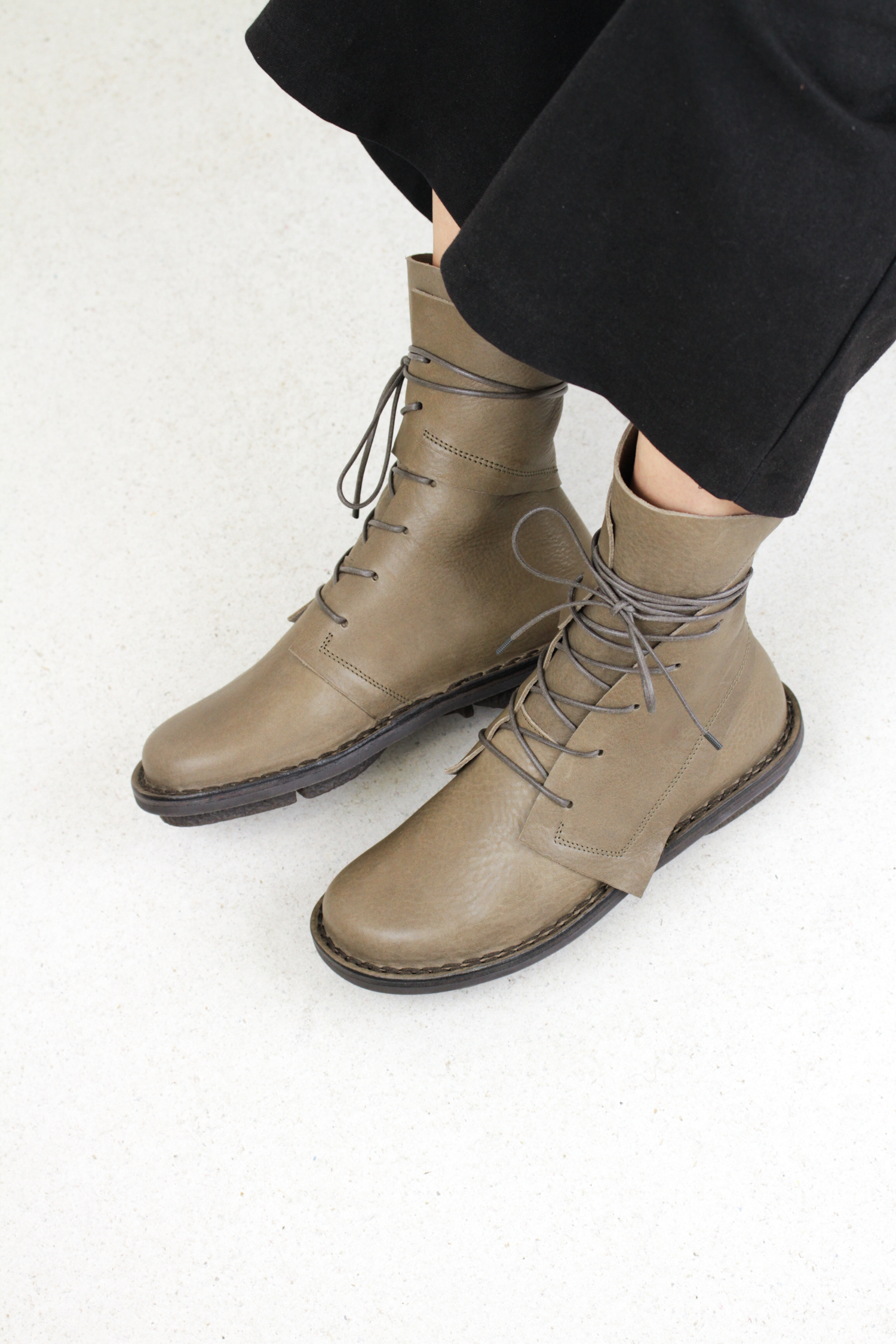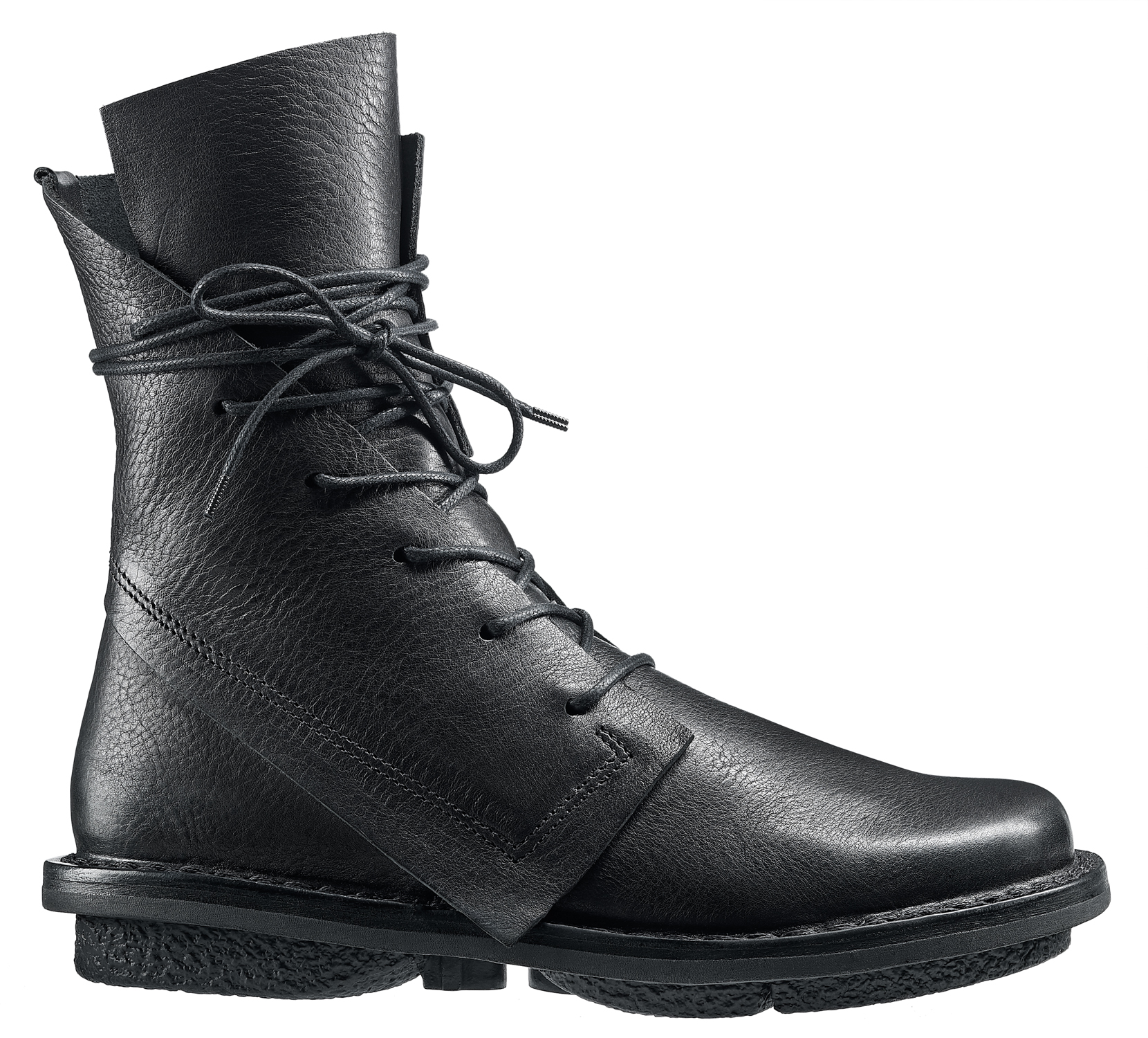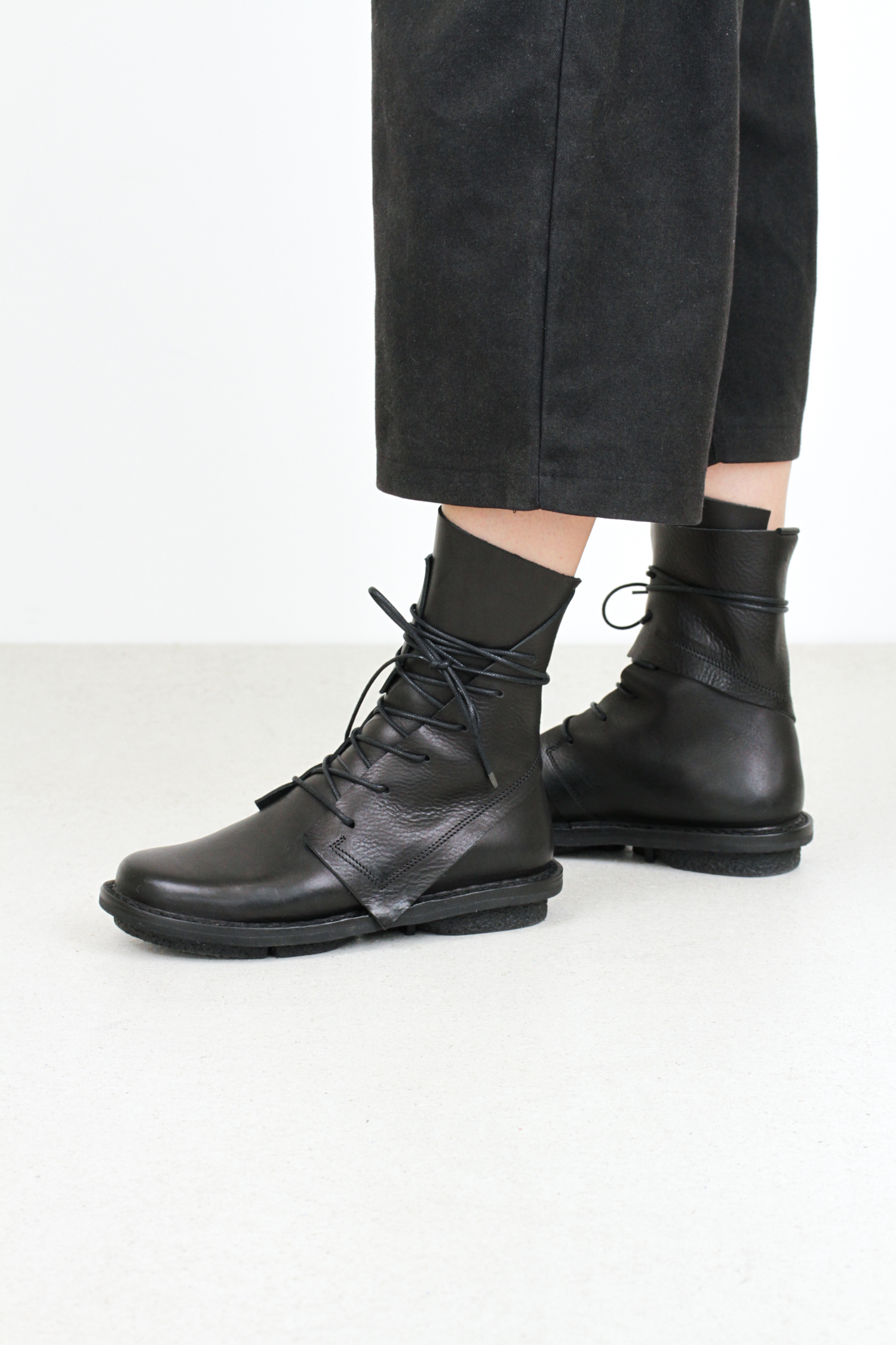 This asymmetrical, lace-up ankle boot features rectangular layering and top-stitching to evoke a slightly dislocated visual-effect.